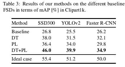 为了验证本文提出的两种策略的通用性,作者又在三个具有代表性的检测器(SSD,YOLO,Faster R-CNN)上做了实验,如下表所示。从表3可以发现,本文方法的优势在不同检测器上都有体现。其中有两点值得注意:(1)DT和PL对Baseline的提升旗鼓相当,说明这两种策略具有互补性且均非常必要;(2)Faser R-CNN的表现明显低于SSD,这和通用目标检测领域的结果是不符合的。为什么?笔者认为可能的一个原因是:SSD中采用了大量的图像数据增强技术,这些数据增强技术在Faser R-CNN的训练过程中是没有的,而本文的卡通图数据集的数据规模要比Pascal VOC低一个数量级(见表1)。从表3的Baseline(Pascal VOC数据训练)和Ideal case(卡通图数据训练)的对比中我们也可以发现:在Baseline上三种检测器的性能是不相上下的,较大的差距却出现在了Ideal case上。