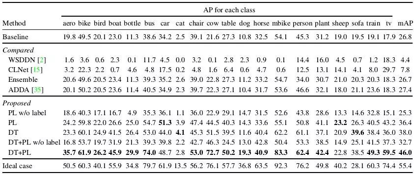 实验采用的检测器是SSD300,作者是在Chainer这个框架下实现的,并公开了源码。此外作者还和两种弱监督的目标检测方法以及一种域适应方法进行实验对比。对比结果如下图所示: