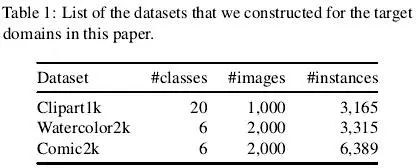 用策略1训练好的检测器给真实卡通画图像打上伪标签,进一步用真实卡通画图像去微调网络,最终得到一个在卡通画图像上表现优异的检测器。由于每张图像有Image-level的标签,所以取每张图像中对应类别得分最高的Bounding Box作为Instance-level的标签,这里基于这样一个强假设,也即每张图像上一个类别只有一个目标。值得一提的是,本文还公开了一个卡通画图像检测的数据集,通过数据集的大小(表1)可以发现这一假设在这个任务上是成立的。