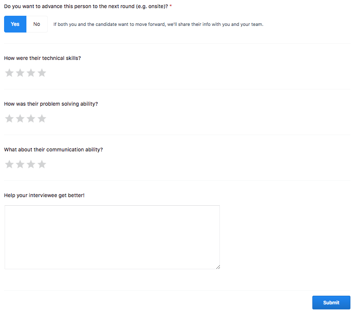 每次面试练习后,面试官都要填上面的表格。候选人也要填写一份类似的表格对他们的面试官进行评分。当双方都填完表格时,他们都可以看到彼此的回复。