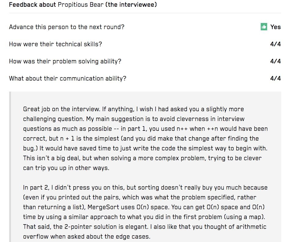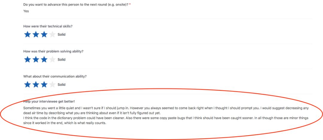而根据我的经验,不说原因就直接结束面试要比让候选人明白原因更尴尬,而且不说原因的话更容易引起候选人的敌对心态。某些候选人可能会为自己争辩(此时您可以礼貌地结束通话),但是如果您给候选人提供建设性的反馈意见——让他们知道是哪里出了问题,建议他们去读哪些书,推荐他们去刷Leetcode之类的题库,等等。大多数人将不胜感激。我个人提供反馈的经历体验都是非常正面的。我曾经很喜欢给应聘者寄书,并且我与其中的许多人一直保持着联系。几年后,其中的有些人成为了Interviewing.io的早期用户。