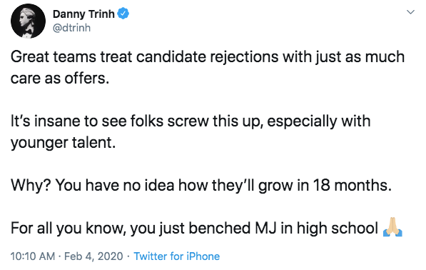 (推文大意:那些好的团队在拒绝候选人的时候,会像给候选人发offer的时候一样用心。