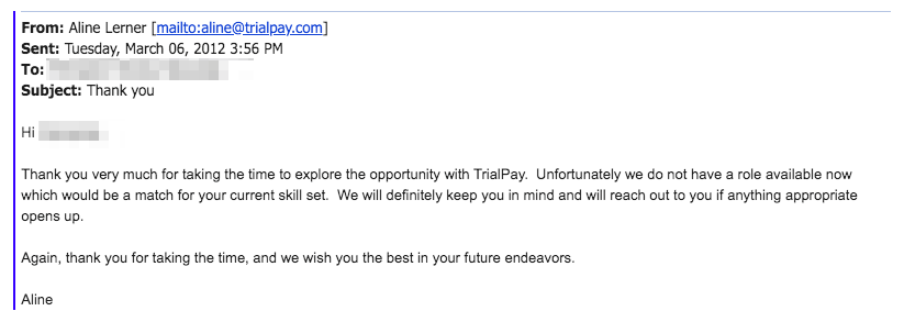 欸,其实我也做过这种事。下面的截图是我在TrialPay担任技术招聘负责人时写的一封拒绝电子邮件。这封电子邮件使我想回到过去,朝着自己的脸抡一锤,然后祝自己在未来的工作中不要再犯这种错误了。