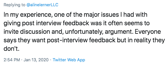 “公司并不想费力为你创建最完美的过程体验。他们只想招人——并且是以理想的高效,便宜,有效的方式进行。招人的过程在于达到他们自己的目的,而不是你的目的。也许如果只是举手之劳,他们也会帮你,但实际上整个过程是以他们为中心的……公司并不相信给候选人反馈会对自己有什么好处。坦白说,他们只能看到害处。”