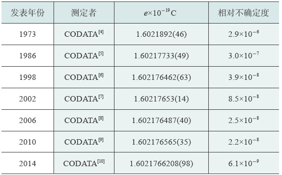 量子霍尔效应提供了电阻的普适标准,使电阻在理论上仅与普朗克常数h 和基本电荷e 有关。通常,这个标准在GaAs/AlGaAs 中执行功能,但石墨烯的电子性质有望成为更实用的装置。实验条件必须在碳化硅上用化学蒸汽沉积生成的高品质石墨烯制造的装置中运行。尤其,在磁通密度为10 T的较宽范围内,当温度升到10 K时,电流增大到0.5 mA,磁通密度降到3.5 T,霍尔电阻能准确到1×10−9的范围内。此外,量子霍尔电阻在石墨烯和GaAs/AlGaAs 之间的测量一致性表现的最终不确定度为8.2 × 10−11,支持了量子霍尔效应的普适性。这也提供了量子霍尔电阻与普朗克常数h 和基本电荷e 的关系。表1 示出了自1973 年以来的基本电荷e 测量进展的一览表,不确定度由10-6减小到10-9量级。表2 示出了自1988年以来的约瑟夫森常数KJ及冯·克里青常数RK测量进展的一览表,KJ的不确定度由10-8减小到10-9量级,RK的不确定度由10-9减小到10-10量级。