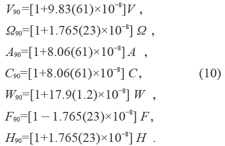 其他的约定电单位按V90和Ω90推算,例如:电流约定单位A90=V90 /Ω90,功率约定单位W90= A90V90,电容约定单位F90=C90/V90等,2014 年平差给出了KJ与KJ−90及RK与RK−90之间的关系: