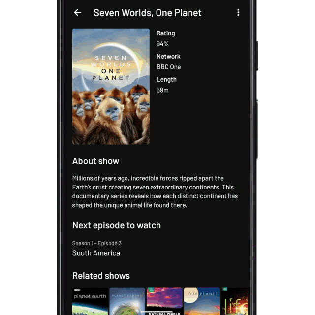 我们有一个示例应用: Tivi,它可以展示 TV 节目的详细信息。关于节目信息,应用内罗列了每一季和每一集。当用户点击其中的某一集时,该集的详细信息将以点击处展开的动画来展示 (0.2 倍速展示):