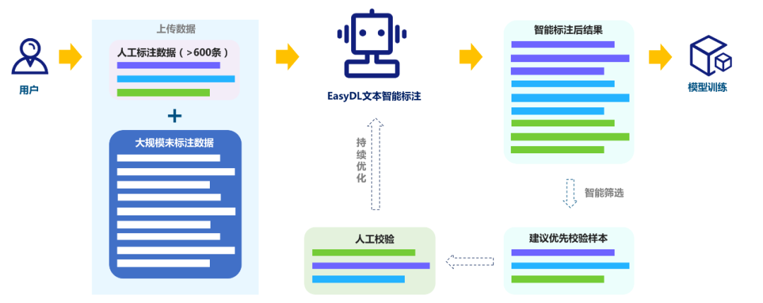 针对开发者数据管理和数据标注过程中的痛点,EasyDL支持了更加灵活的数据格式,当前可支持zip、Excel、TXT三种文件格式进行上传。除了提供在线标注能力外,还提供智能标注功能,大幅降低了开发者的标注成本,开发者可直接上传未标注数据体验该功能。