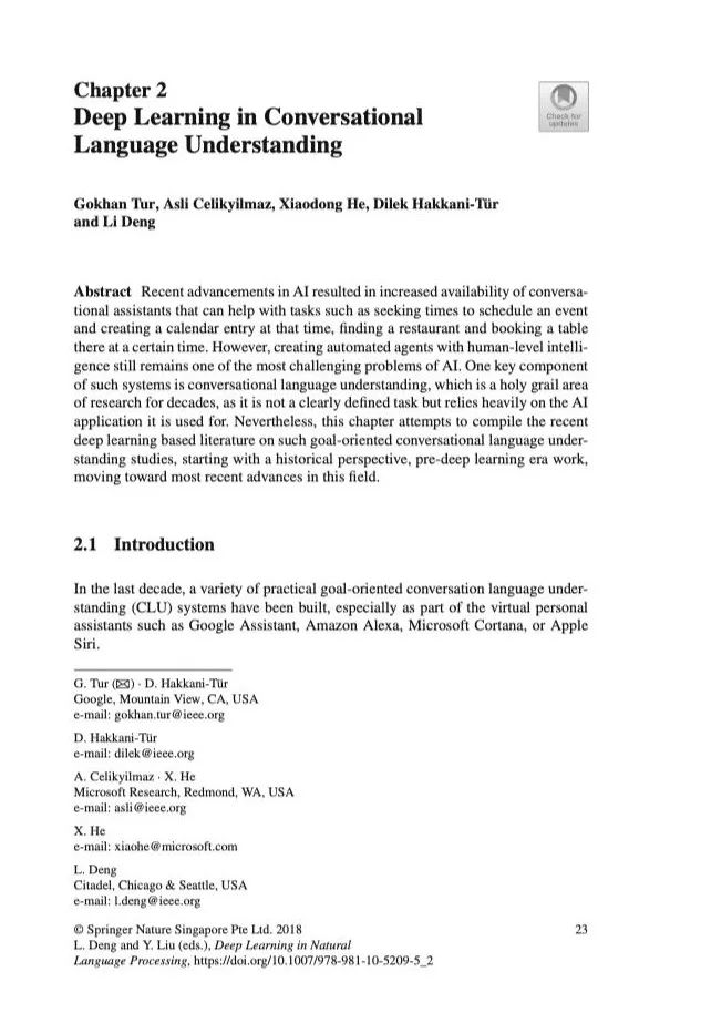 Chapter 2: 对话理解系统中的深度学习(Gokhan Tur, Asli Celikyilmaz,何晓冬, Dilek Hakkani-TÜr, 邓力)Deep Learning in Conversational Language Understanding