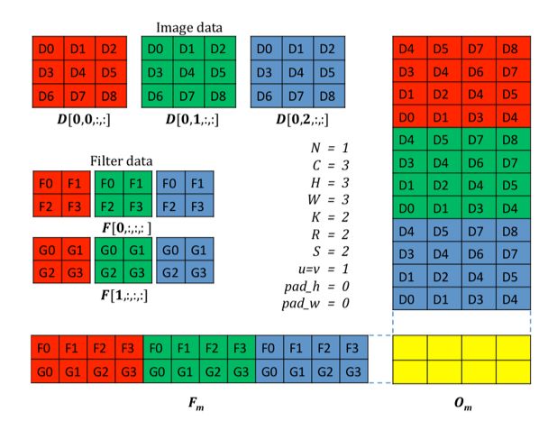 使用im2col的方法将划窗卷积转为两个大的矩阵相乘,见下图: