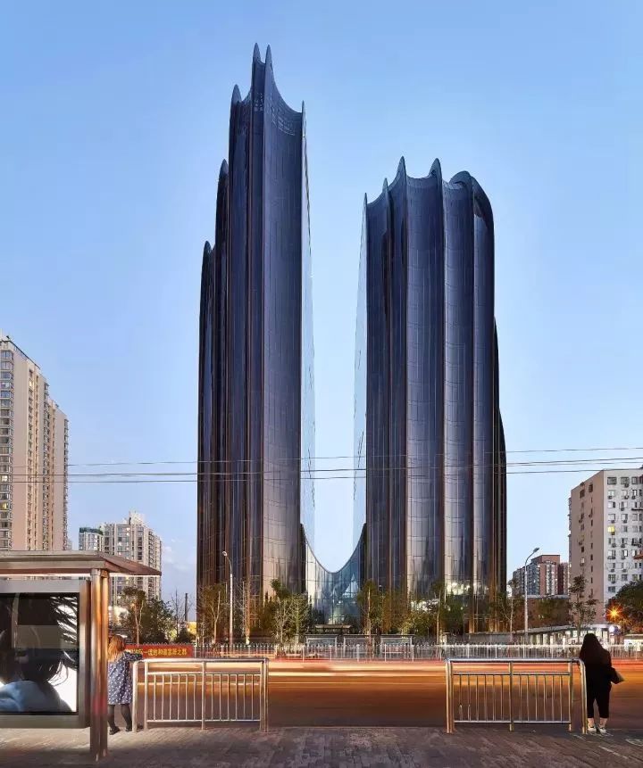 这是马岩松山水城市理念下的“墨色山水”,占地面积近35000平方米,由包括写字楼、住宅、商铺的10座建筑组成。“高低错落,好像一幅展开的山水画卷,又像是一组盆景”,他的建筑事务所 MAD 官网这么描述。