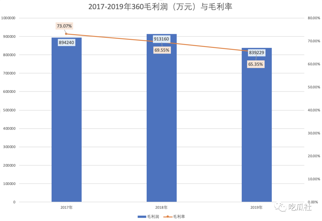 2017年,360的毛利率为73.07%,到2018年跌倒70%以下,为69.55%。2019年,再度出现下跌,到了65.35%。
