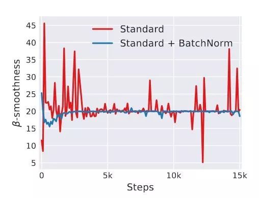 图21展示了用L-Lipschitz函数来衡量采用和不采用BN进行神经网络训练时两者的区别,可以看出未采用BN的训练过程中,L值波动幅度很大,而采用了BN后的训练过程L值相对比较稳定且值也比较小,尤其是在训练的初期,这个差别更明显。这证明了BN通过参数重整确实起到了平滑损失曲面及梯度的作用。