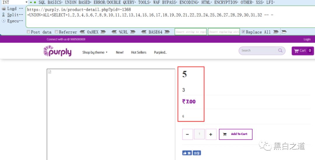 https://purply.in/product-detail.php?pid=1368 order by 33 -- - 字段为33个时,页面返回错误,说明字段总个数为32