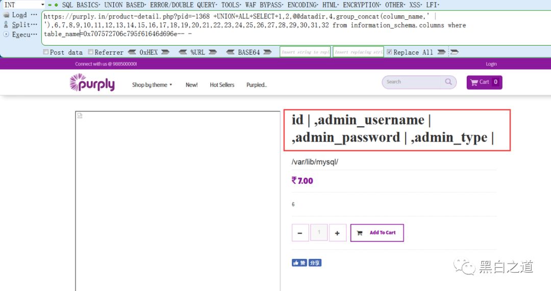 很显然,’purply_admin’很可能就是我们要的管理表,继续查管理表的所有字段名,注意后面的数据库名,实际中最好 16 进制编码下