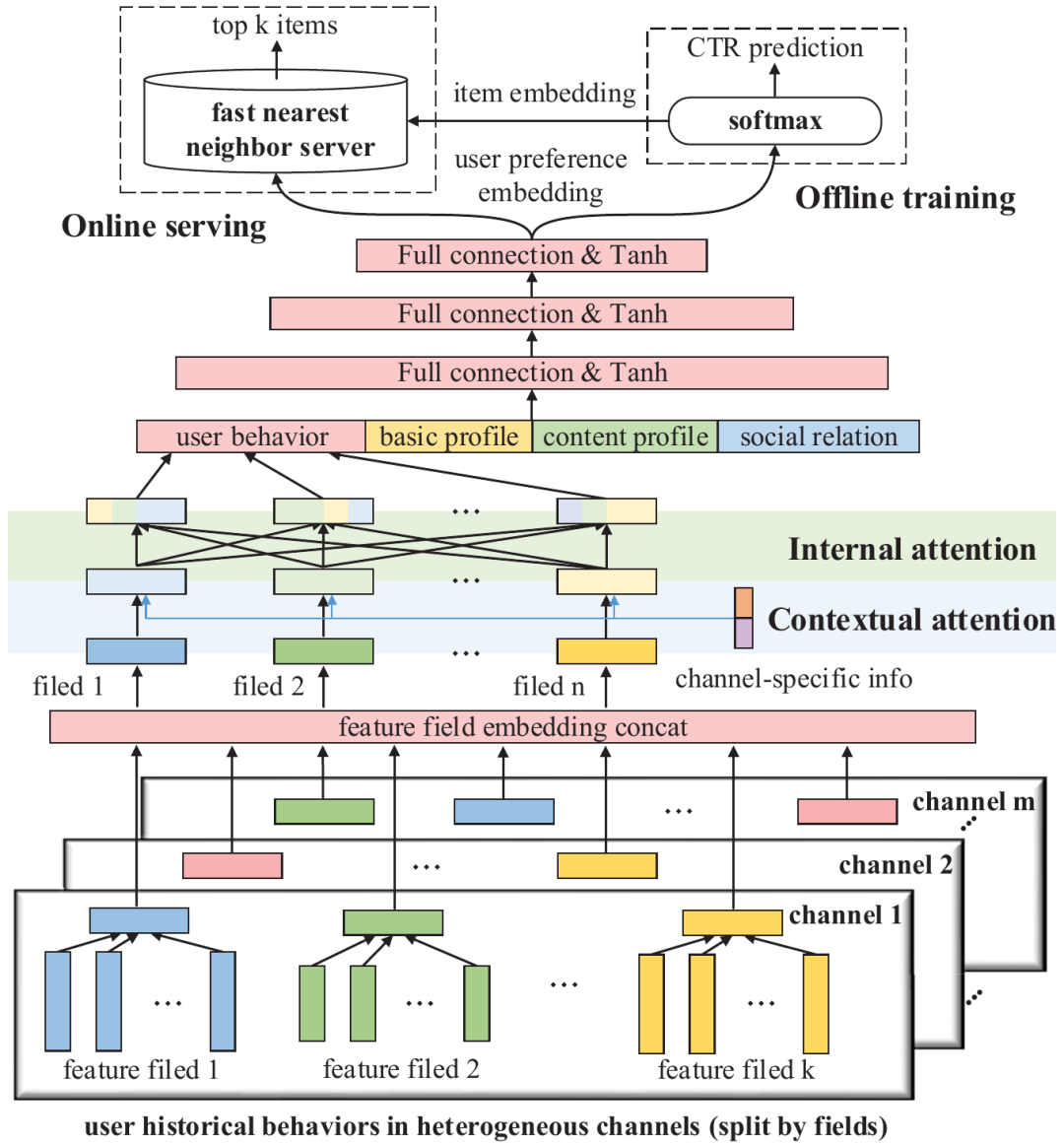 简介:现实世界中集成的个性化推荐系统通常处理数百万种异构项目。由于巨大的计算成本,使用复杂的模型进行完整的语料库检索非常具有挑战性。因此,大多数大型推荐系统由两个模块组成:一个用于有效检索一小部分候选人的多渠道匹配模块,以及一个用于精确个性化推荐的排名模块。但是,在添加新通道或新数据源时,多通道匹配通常会遇到冷启动问题。为解决此问题,我们提出了一种新颖的内部和上下文关注网络(ICAN),该网络突出显示了特定于通道的上下文信息以及多个通道之间的特征字段交互。在实验中,我们通过实际集成推荐系统上的案例研究进行离线和在线评估。重大改进证实了ICAN的有效性和鲁棒性,尤其是对于冷启动通道。目前,ICAN已部署在数百万用户使用的微信热门故事上