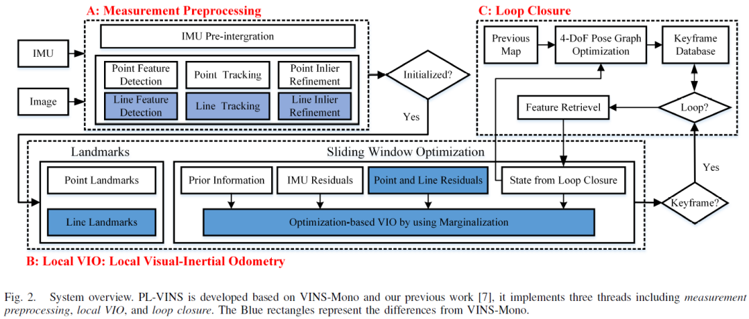 本文介绍了PL-VINS,一种基于实时优化的具有点和线特征的单目VINS方法,它是在最先进的基于point的VINS的基础上发展起来的,我们观察到当前的工作使用LSD算法来提取线特征;然而,最小二乘支持向量机是为场景形状表示而不是姿态估计问题而设计的,由于其计算成本高,成为实时性的瓶颈。通过研究隐参数调整和长度抑制策略,提出了一种改进的最小二乘算法。修改后的LSD运行速度至少是LSD的三倍。此外,通过用普吕克尔坐标表示空间线,线估计中的剩余误差根据点到线的距离来建模,然后通过迭代更新普吕克尔坐标的最小四参数正交表示来最小化该距离.