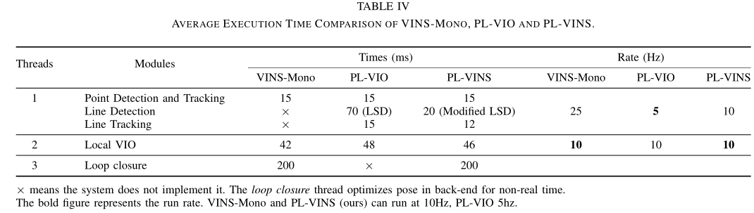 请注意的是VINS-Mono在线程2中最多需要~42毫秒,而PL-VINS是~46毫秒,PL-VIO在线程1中是~100毫秒.与PL-VIO算法相比,PL-VINS算法使用改进的最小二乘算法效率更高.