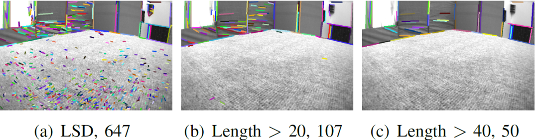 LSD是一种无参数调整的线检测器,设计用于场景形状表示.在这种情况下,在782×480像素的图像中检测647个线特征需要62ms.然而,大量的短线特征可以被视为姿态估计问题的异常值,因为它们难以匹配,并且可能在下一帧中消失,更不用说剔除轮廓的困难了.在647个线特征中,有107个线特征的长度超过20个像素,50个线要素的长度超过40个像素.事实上,长线特征比短线特征更容易匹配,并且更有可能出现在下一帧中.