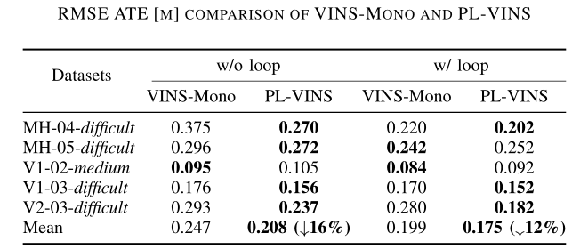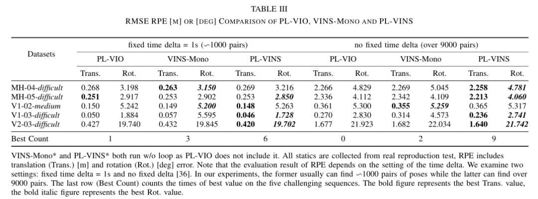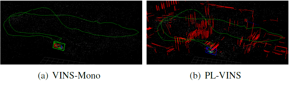 总的来说, 在我们的实验中,VINS-Mono和PL-VINS都能够在10Hz下运行,而PL-VIO则不能.