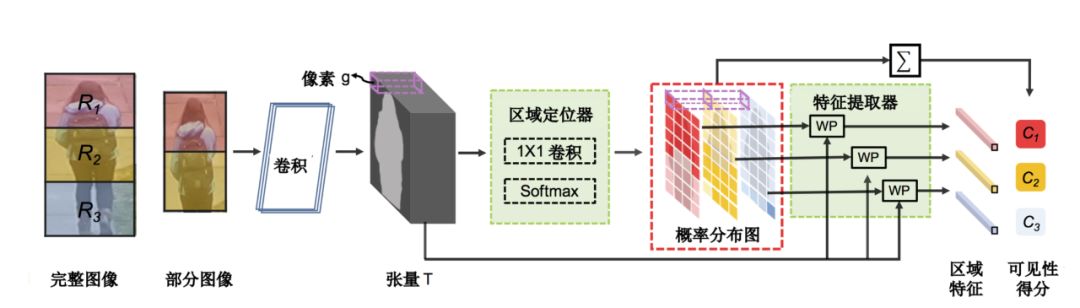 本文在完整的行人图像上预先定义一个固定的部件分割,将图像分成 p 个部件(如图 2 分成上、中、下三个部件,即 p=3)。对于每一幅行人图像,VPM 输出固定数量的部件特征,以及相应的部件可见性得分。