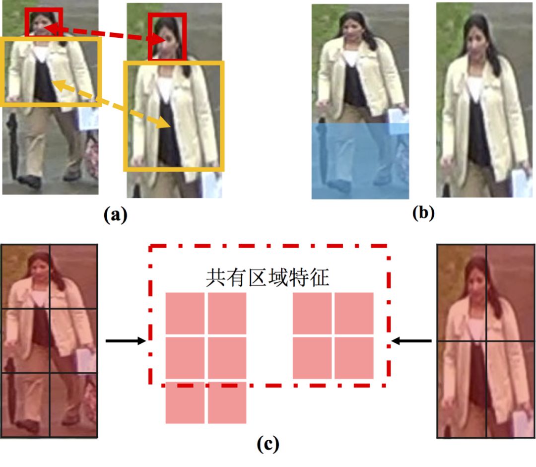 图 3:部分成像下 re-ID 的困难 (a),(b) 及解决思路 (c)