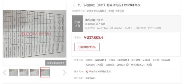 【千人围观无人出价,乐视908件商标流拍】北京市第一中级人民法院于10月10日至11日在京东网络司法拍卖平台上,对乐视控股(北京)有限公司名下的908件商标进行公开拍卖。11日上午10点,乐视控股(北京)有限公司名下包括“LE”、乐视手机“LeMobile”等908件商标一拍因无人出价而以流拍告终。(潇湘晨报)