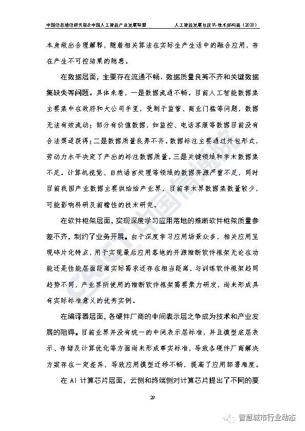 第二,围绕算法,数据和算力的“三驾马车”,分析了机器学习算法、AI加速芯片、训练及推断数据、软件框架、编译器等基础技术的基本情况、现状和特点;