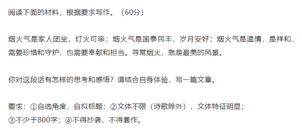 最后再来看看天津的题目。不愧是“哏儿都”,今年高考作文题目太接地气了。此时此刻,被封控许久的人们,实在太需要烟火气来重燃对生活的热爱了。
