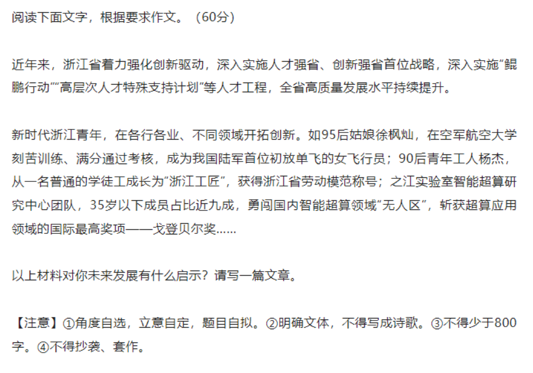 今年浙江省的考卷上提出“人才强省、创新强省”的战略,仔细品品,这是不是在号召浙江省的广大青年才俊留在浙江,共建美好家园。