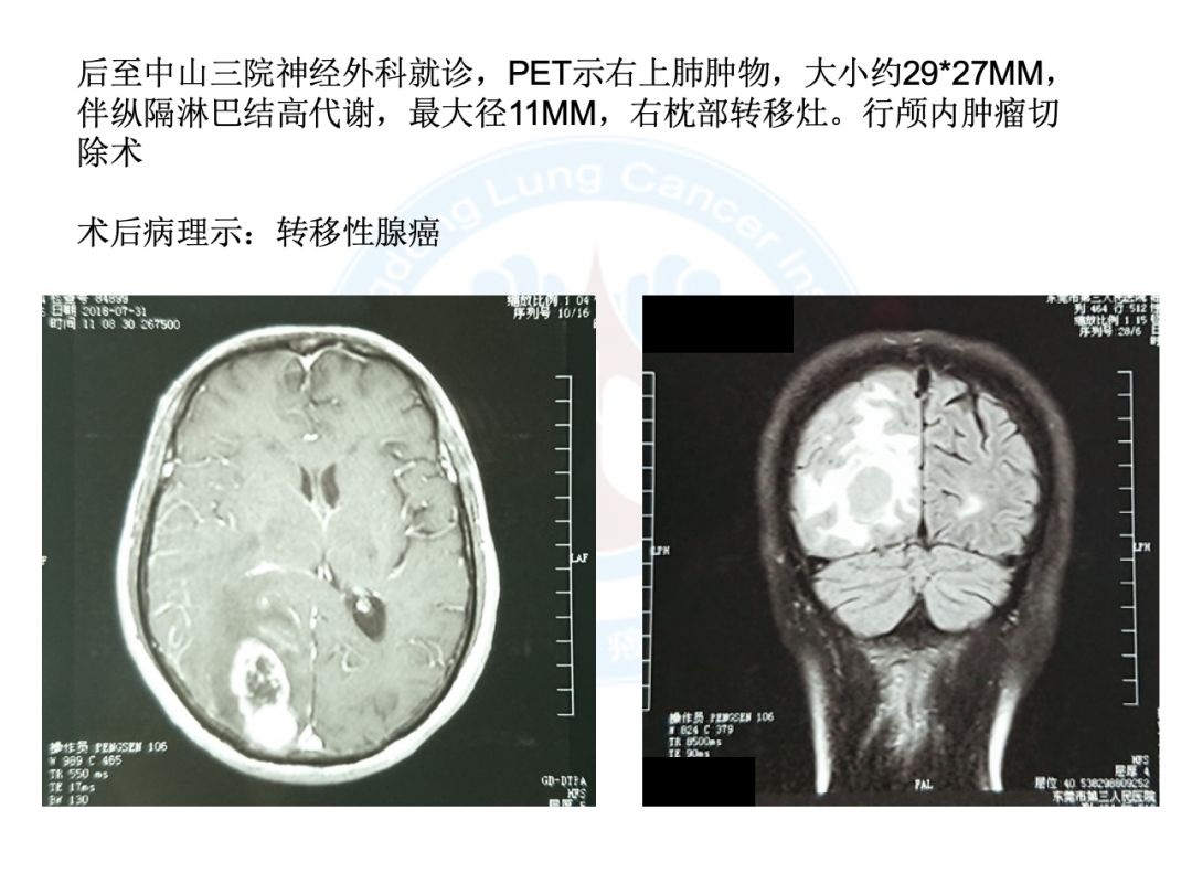 3)后至中山三院神经外科就诊,PET示右上肺肿物,大小约29mm×27mm,伴纵隔淋巴结高代谢,最大径11mm,右枕部转移灶。行颅内肿瘤切除术。