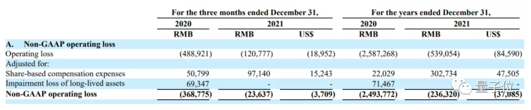 数据显示,2021年GAAP准则下经营亏损(operating loss)为5.39亿元,相比2020年亏损的25.87亿元有所缩小: