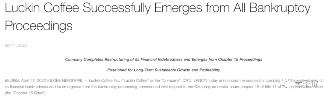 2022年4月11日,瑞幸咖啡宣布,目前已走完了《美国法典》第11篇第15章的规定程序,金融债务重组成功完成。