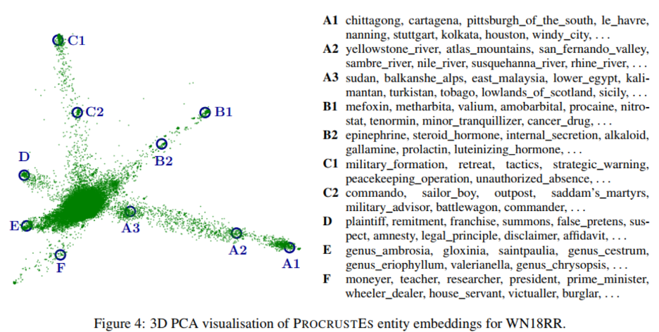 作者对训练的实体嵌入进行可视化,即使用主成分分析PCA对嵌入进行降维,将实体嵌入的维数从2K降为3,下图显示了可视化结果,从中我们可以看到一个有6个“手臂”的图表。首先,同一臂上的实体在语义上是相似的,或者说这些实体属于同一个类别。具体来说,A臂上的实体是位置,B臂上的实体是生化术语,C臂上的实体是军事相关的实体。D、E、F臂上的实体分别是指法律概念、植物学概念和职业概念。第二,手臂上的每个簇/位置之间存在显著差异:对于A臂,A1是城市的实体,如斯图加特、休斯顿、南宁;A2是关于河流、山脉等实体的;A3为国家或地区实体。同样,B1主要由医药名称组成,B2中的实体明显与化学术语有关。