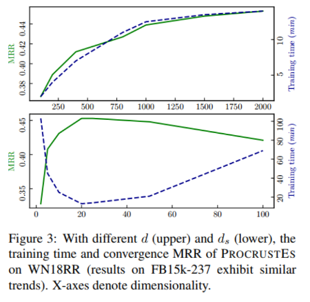 实验还表明,超参数d和ds的选择对PROCRUSTES的有效性和效率有重要影响。对于整个嵌入空间的维数,固定ds=20,设置d={100;200;400;800;1k;1:5K;2K},结果如下图所示。随着d的增加,性能(MRR)增加,但训练时间也随之增加。训练时间的曲率在d>1K时几乎饱和,作者以d=2K作为WN18RR和FB15k-237的最佳设置。