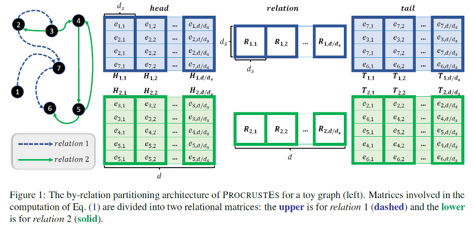 PROCRUSTES模型是建立在分段嵌入的基础上的,这种技术已经被一些很有前途的KGE学习方法(如RotatE, SEEK,OTE)利用。与传统的KGEs方法中每个实体只对应一个向量不同,采用分段嵌入的算法显式地将实体表示空间划分为多个独立的子空间。在训练期间,每个实体被编码为一串解耦的子向量(即不同的段,因此得名)。例如,如Figure 1所示,对一个包含7个实体的图进行编码,第t个实体的嵌入是其d/ds个子向量的逐行拼接,其中d和ds分别表示实体向量和子向量的维数。采用分段嵌入允许并行处理结构上分离的子空间,从而显著提高整体训练速度。此外,分割嵌入还可以增强模型的整体表现力,同时大大减少矩阵计算的维数。