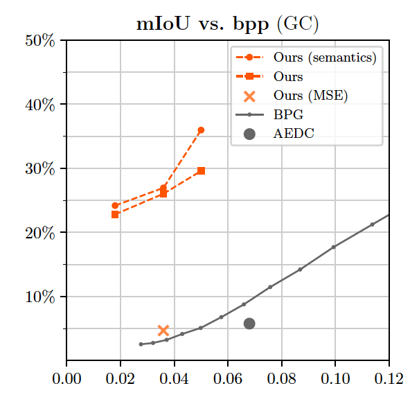 与BPG相比,我们达到了较高的mIoU的值,利用语义进行训练时这个值进一步增加