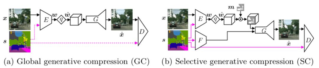 上图是研究人员所提出的压缩网络。E代表图像x的编码器,或者作为图像s的语义标签映射。q将潜在的代码w量化为w^。G是生成器,产生解压缩的图像x^,D是用于对抗训练的鉴别器。对于SC,F从s中提取特征,经过二次采样的热图乘以z^以分配空间位。