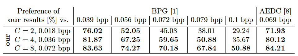 此次试验结果要比BPG好,即使当BPG使用的bpp数量是我们的两倍也是如此。在本文中,系统在ADE20K数据集和Kodak压缩基准测试上获得了相似的结果。