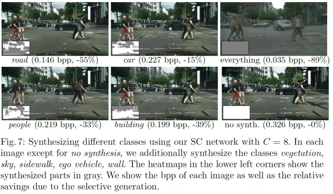 左下角的热图显示了合成对象,灰色是合成的部分。同时还显示了每张图的bpp,以及由于选择性生成节省的尺寸