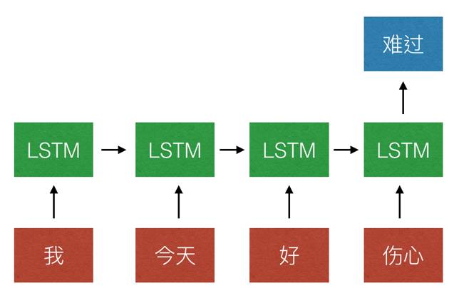 example: 假设,使用者输入:「我今天好伤心」,分词完的结果是「我 今天 好 伤心」,则我们希望model 可以输出 「难过」。 model 里面的简单运算概念如下图所示。 LSTM 会一直把资讯往后传,并拥有记忆功能,最后整合所有资讯后,再做出判断。