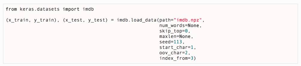 2. Keras 已安装完毕,则 IMDB 可由此方式入手(https://keras.io/datasets/) 。此API的底层:https://github.com/fchollet/keras/blob/master/keras/datasets/imdb.py