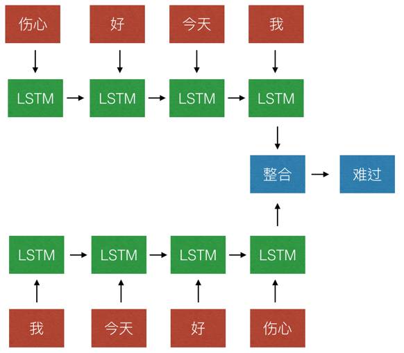 这种做法有一个好处,以这句话「我今天好伤心」为例,重点刚好在句尾。但如果换一个句子,「真开心,明天要出去玩了」,此句的重点则在句首。因此,可以用Bi-directional LSTM 来处理这种问题。