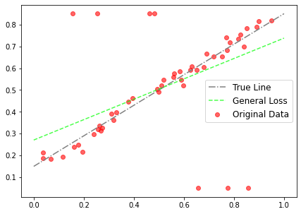 利用鲁棒损失函数的一般形式和固定α值,可以得到拟合直线。图4中绘制了原始数据、真实线(生成数据点时使用的具有相同斜率和偏差的线,排除异常值)和拟合线。