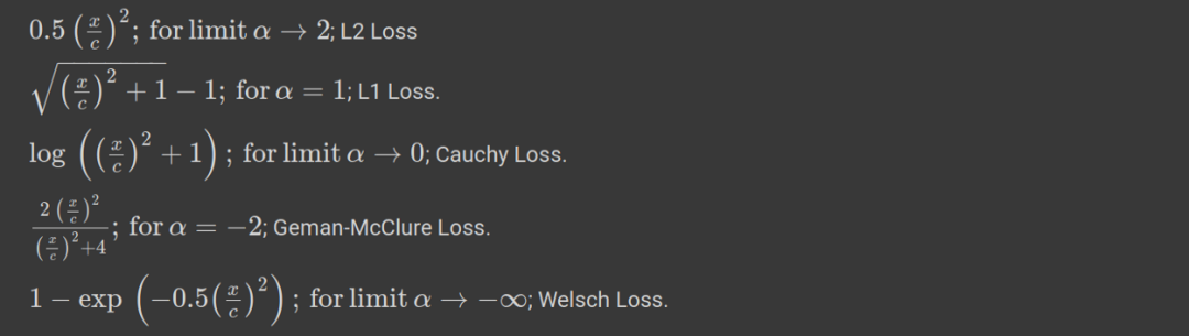 α控制损失函数的鲁棒性。c可以看作是一个尺度参数,在x=0附近控制弯曲的尺度。由于α是超参数,我们可以看到,对于α的不同值,损失函数具有相似的形式。让我们看看下面: