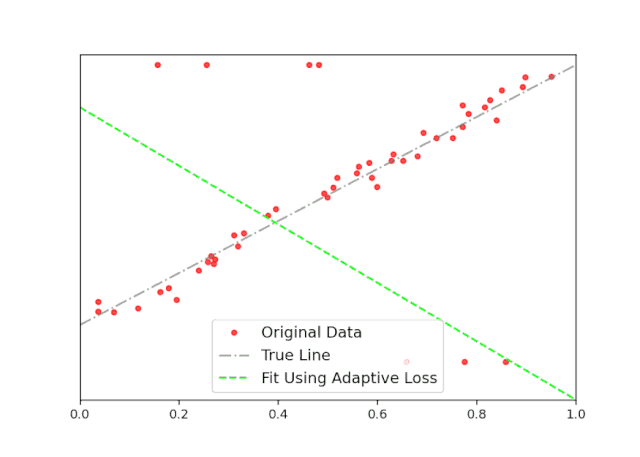 损失函数的一般形式不允许α改变,因此我们必须手工调整 α参数或执行网格搜索。此外,如上图所示,拟合会受到离群值的影响。这是一般情况但是如果我们使用损失函数的适应性版本会发生什么呢?我们调用adaptive loss模块,并初始化α,让它在每个迭代步骤中自适应。