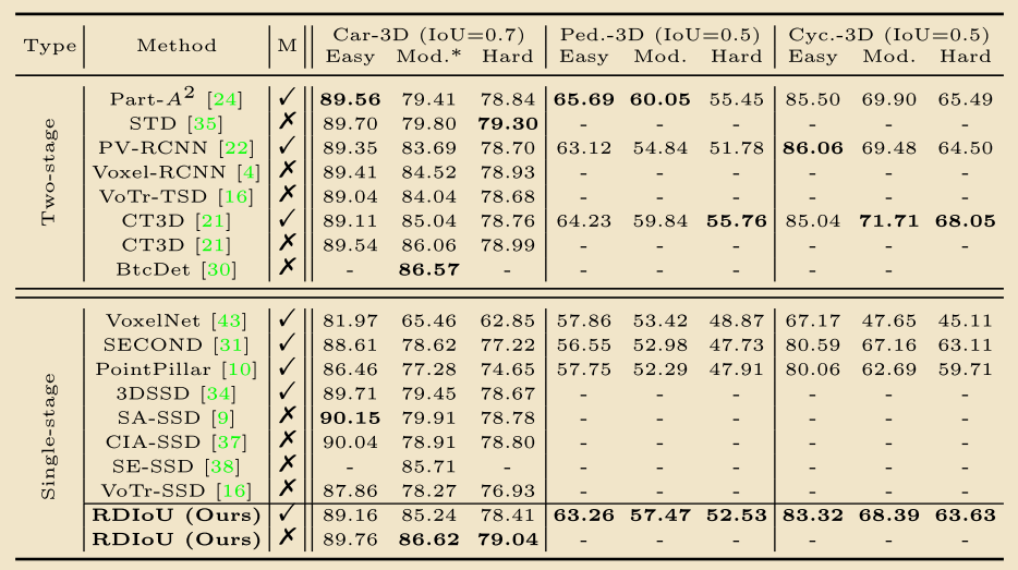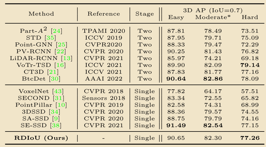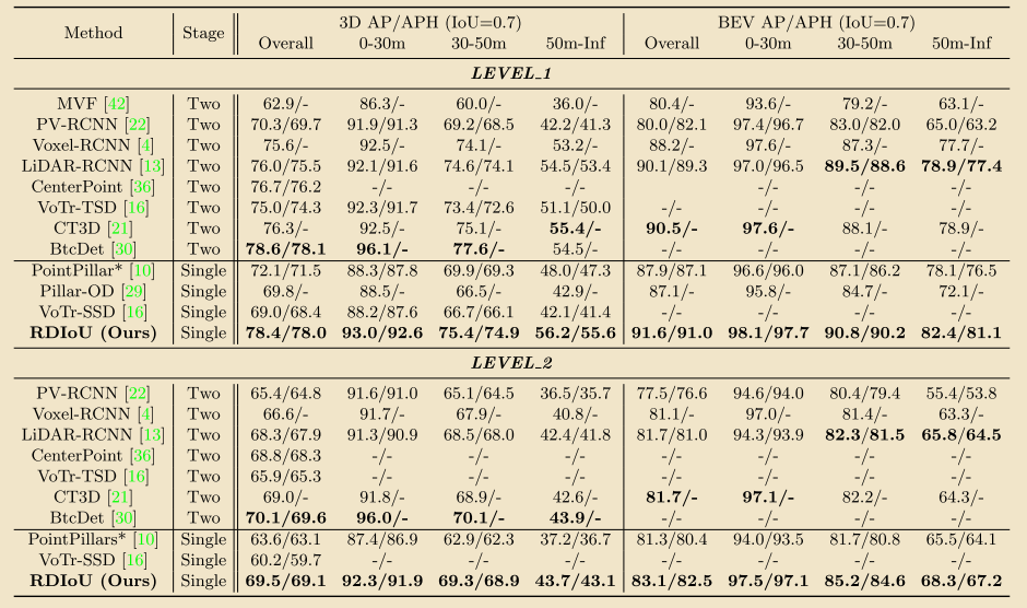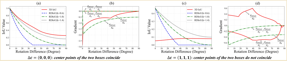 这个也很好理解,类比2D HBBs之间的overlap计算方法就能得到。那么问题就落在怎么确定第四维度的和上。作者的做法是,直接取,而令。可以看到,出发点很有趣,落脚点其实相对简单的。但是这会带来一个直观问题:这个所谓的4D IoU不再能表征3D IoU,有可能导致损失和评估的不一致。作者通过下面的实验证明了提出的RDIoU的有效性: